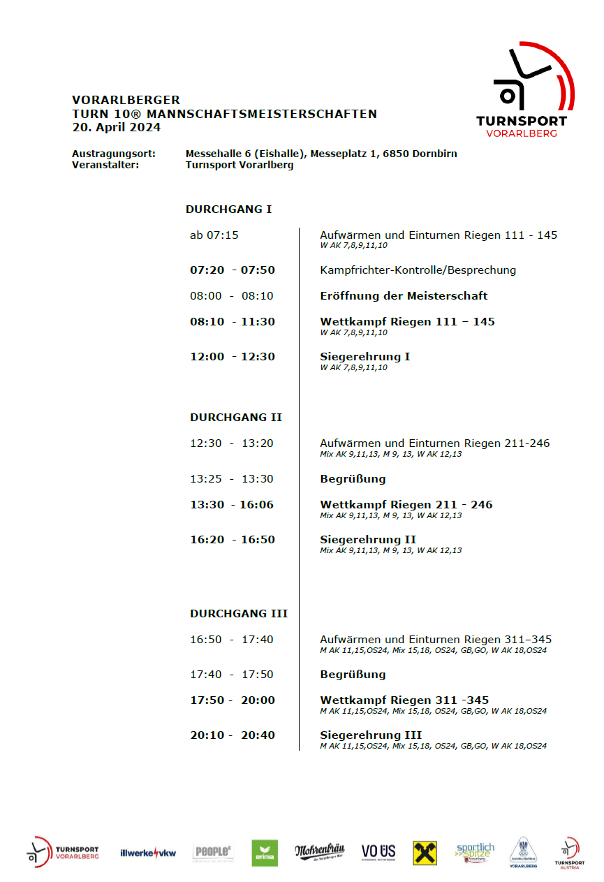 Der Zeitplan, die Teilnehmer:innen-Übersicht, sowie der Riegenlaufplan für die Mannschaftsmeisterschaften im Turn 10 am 22. März 2024 in Dornbirn sind online.